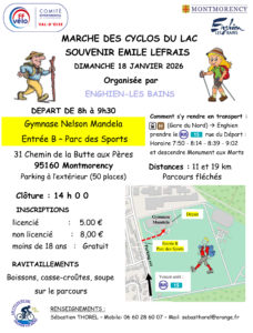 Le club des Cyclos du Lac d'Enghien organise une marche le dimanche 18 janvier 2026 au départ du parc des sports du gymnase Nelson Mandela de Montmorency. Deux parcours au programme : 11 et 19 km. Les frais d'inscriptions pour les adhérents de l'UVA seront pris en charge par le club.