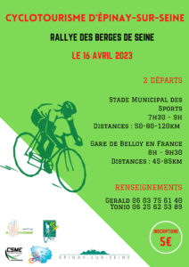 Nos voisins d'Épinay-sur-Seine nous invitent à leur traditionnel rallye des Berges de Seine qui se déroulera le 16 avril 2023. Distances proposées : 45, 80 ou 120 km. Trace du 45 km au départ d'Épinay : https://www.openrunner.com/route-details/16507773 Trace du 80 km au départ d'Épinay : https://www.openrunner.com/route-details/16373623 Trace du 120 km au départ d'Épinay : https://www.openrunner.com/route-details/16547361 Tarif : 5 € Départ groupé en vélo à partir du Monoprix à 7h30 ou rendez-vous sur place à 8h00. L’inscription à cet événement est prise en…