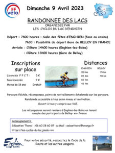 La randonnée des lacs, organisée par les Cyclos du Lac d'Enghein se déroulera en ce dimanche 9 avril 2023. Parcours fléchés, récompenses, points de ravitaillements échelonnés sur les parcours. Randonnée accessible à tous selon niveau et motivation. Ouvert à tous y compris aux VAE. Distances 45 km - trace téléchargeable sur Strava : https://www.strava.com/routes/3078415376077028026 60 km - trace téléchargeable sur Strava : https://www.strava.com/routes/3078415135943903954 85 km - trace téléchargeable sur Strava : https://www.strava.com/routes/3078414466383896480 110 km - trace téléchargeable…