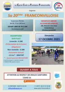 La Franconvilloise prévue pour le 9 mai, qui avait été annulée du fait de la pandémie, a été finalement reportée au 17 octobre. Pour cette 20e édition, le Cyclo Club la Fontaine Franconville propose aux participants trois parcours : 50, 75 et 100 km. Inscription sur place. Licenciés : 4, 50 € Non licenciés ; 6,50 € – 18 ans : gratuit La prise en charge des inscriptions est assurée par l'UVA pour les membres du club. Départ groupé à…