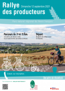 "A la découverte des producteurs du Vexin français". Enfourchez votre vélo et rendez-vous de ferme en ferme en traversant les paysages et les villages vexinois ! Au départ de la bergerie de Villarceaux à Chaussy > Boucle 1 - 35 km - 300 m de dénivelé - Ferme des Millonets, Vienne-en-Arthies - Potager du château, La Roche-Guyon - Permaculture au Moulin de Pont Rû, Bray-et-Lû - Fournil de la Bergerie, Chaussy - Maraîchers « Les plants de demain », Chaussy…