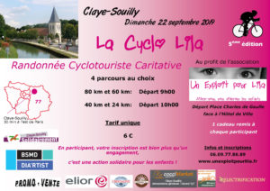 Depuis 2015, plus de 400 cyclos s'élancent chaque année sur les parcours de La Cyclo Lila pour rouler solidaire autour de Claye-Souilly. Pour la cinquième édition qui se tiendra le dimanche 22 septembre 2019 quatre parcours sont proposés : 24, 40, 60 ou 80 km. Inscriptions possibles sur le site Internet : Inscription