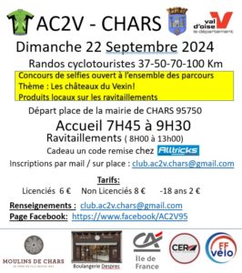 Le club de Chars organise sa randonnée annuelle. Au programme : Route P1 : distance 37km - dénivelé positif 285m - Très facile P2 : distance 50km - dénivelé positif 556m - Facile P3 : distance 70km - dénivelé positif 744m - Difficile P4 : distance 100km - dénivelé positif 1200m - Difficile Les frais d'inscription pour les adhérents de l'UVA seront pris en compte par le club. Un départ groupé à vélo se fera de Monoprix à 7h00 ou…